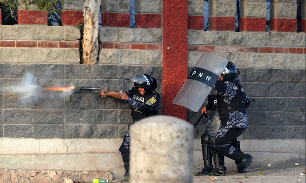 3 marzo 2016. La polizia antisommossa spara gas lacrimogeni contro degli studenti che manifestano a Tegucigalpa, in Honduras, contro l’uccisione dell’attivista indigena Berta Caceres, assassinata da un commando a La Esperanza, nell’est del Paese. L’ecologista onduregna era nota per le sue battaglie ambientaliste in difesa dei fiumi del Paese e per i diritti degli indigeni.