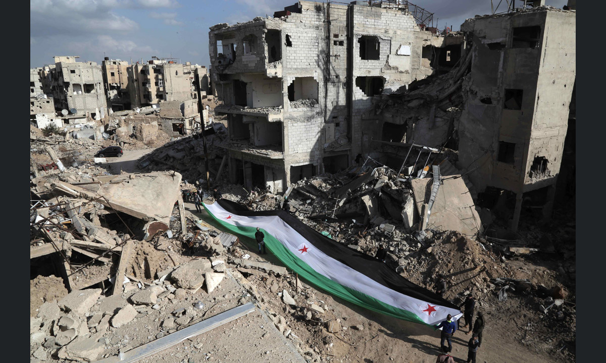3 marzo 2016. Una grande bandiera siriana dell’era pre-baathista, ora utilizzata come propria dall’opposizione siriana, viene trasportata da un piccolo corteo durante una protesta anti-regime, tra le macerie degli edifici distrutti nel quartiere di Jobar, nella periferia est della capitale Damasco, in Siria.