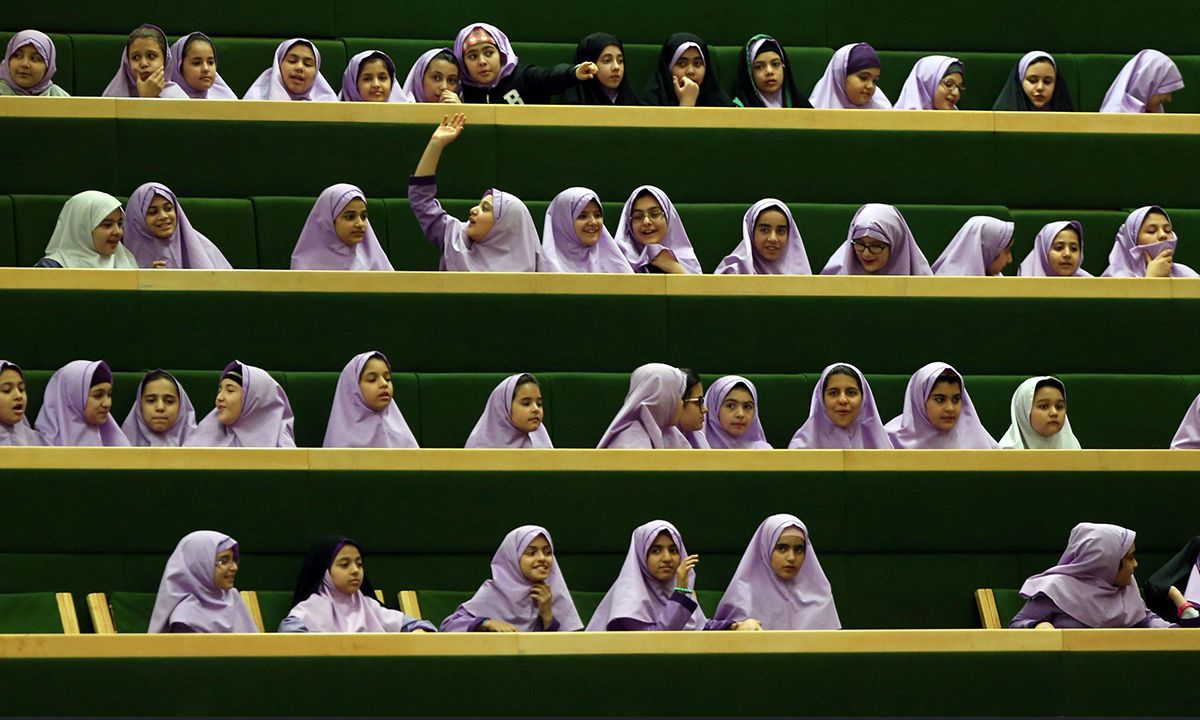 1° marzo 2016. Un gruppo di studentesse iraniane in visita al Parlamento di Teheran, in Iran, dopo la proclamazione dei risultati delle elezioni del 26 febbraio, che hanno indicato una nuova maggioranza, moderata, riformista e filogovernativa in un Parlamento finora dominato dai fondamentalisti-conservatori.