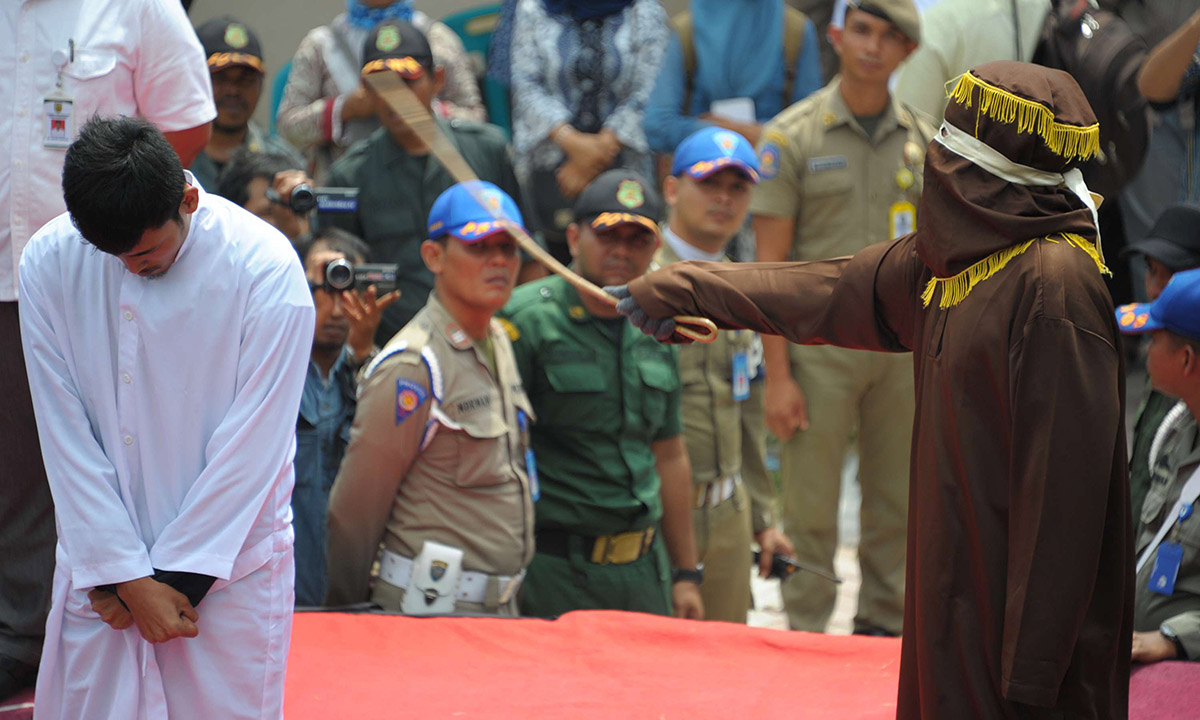 1° marzo 2016. A Banda Aceh, in Indonesia, un agente della “La polizia della Sharia” frusta pubblicamente un uomo che ha infranto la legge islamica. L’uomo aveva trascorso del tempo in una stanza con una giovane donna. Insieme a lui, hanno subito analoga punizione altre 17 persone.