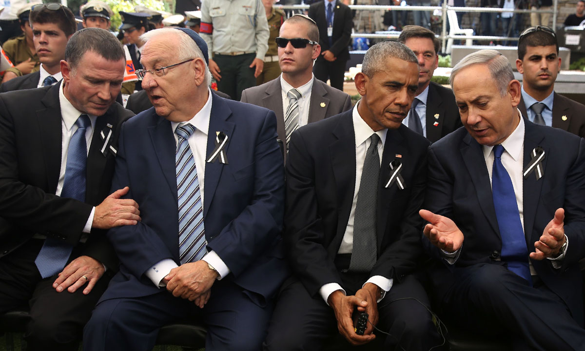 Gerusalemme, Israele, 30 settembre 2016. Il primo ministro israeliano Benjamin Netanyahu e il Presidente USA Barack Obama durante i funerali dell’ex presidente Shimon Peres