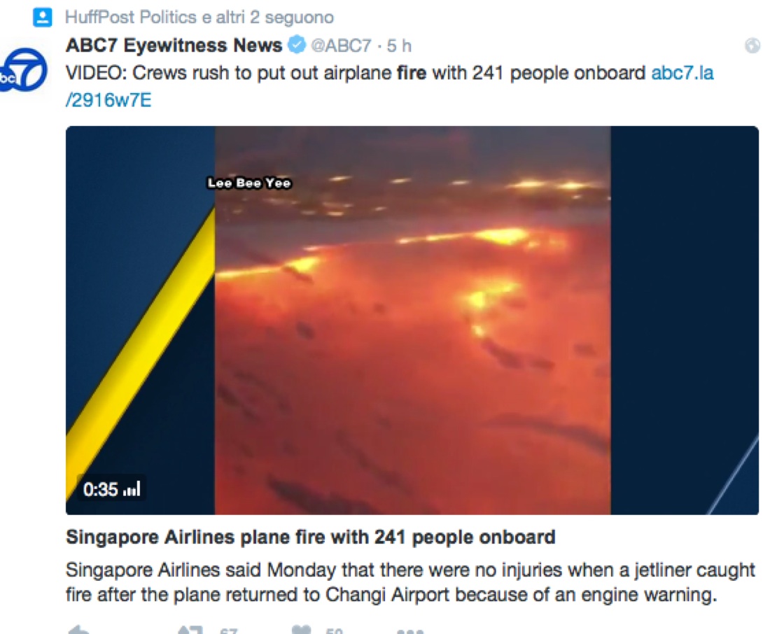 singapore-aereoSingapore, 27 giugno 2016: l’aereo della Singapore Airline diretto a Milano che ha preso fuoco