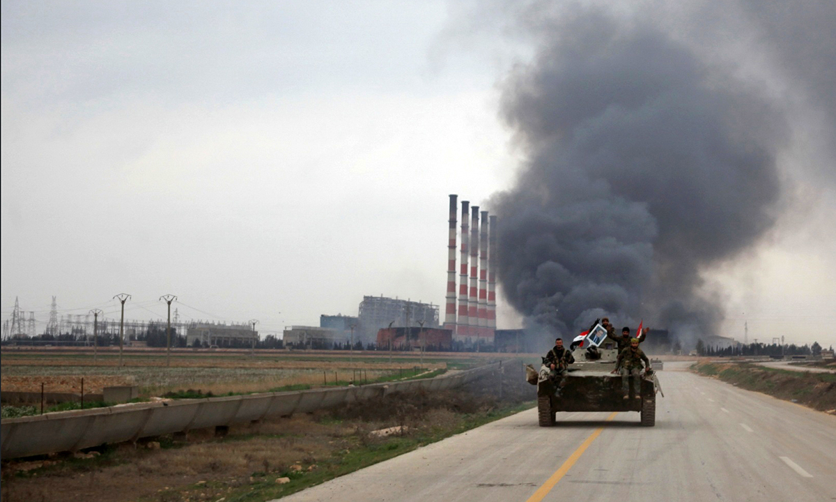 21 febbraio 2016. Syrian government forces drive tanks near smoke billowing from Aleppo’s thermal power plant after they took control of the area on the eastern outskirts Syria’s northern embattled city from Islamic State (IS) group fighters on February 21, 2016. In two days Syrian government forces have taken more than a dozen villages from IS jihadists around a stretch of highway that runs east from the northern city of Aleppo to the Kweyris military base. / AFP / GEORGE OURFALIAN (Photo credit should read GEORGE OURFALIAN/AFP/Getty Images)