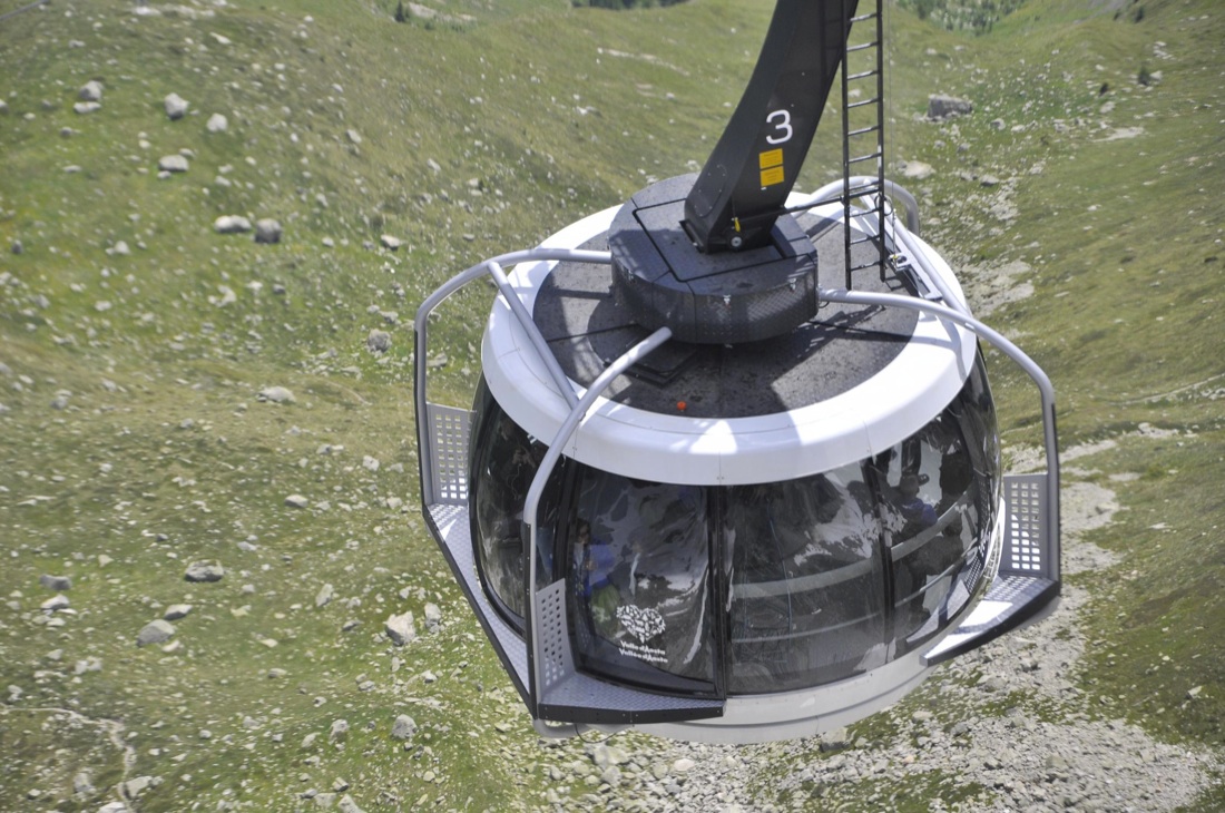 All’interno, la sede della Mostra dei cristalli, un ristorante, un bar, punti informazione multimediali. Le cabine sono di forma semisferica con una capacità di carico fino a 80 persone, ruotano a 360° lungo tutto il percorso, per offrire una vista completa sulle vette circostanti. Una telecamera posta sul pavimento trasmette invece le immagini del panorama sottostante.