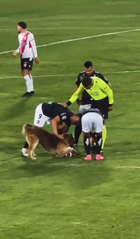 Un cane tanto grosso quanto simpatico invade il campo da calcio dei giocatori durante la partita e va dritto verso il pallone. Una volta che lo ha in bocca non ha nessuna intenzione di lasciarlo andare, così uno dei giocatori in campo lo ha dolcemente preso in braccio e portato a bordo campo. L’espressione interdetta ma pacata del cane mentre si lascia portare via alla fine del video è esilarante.
