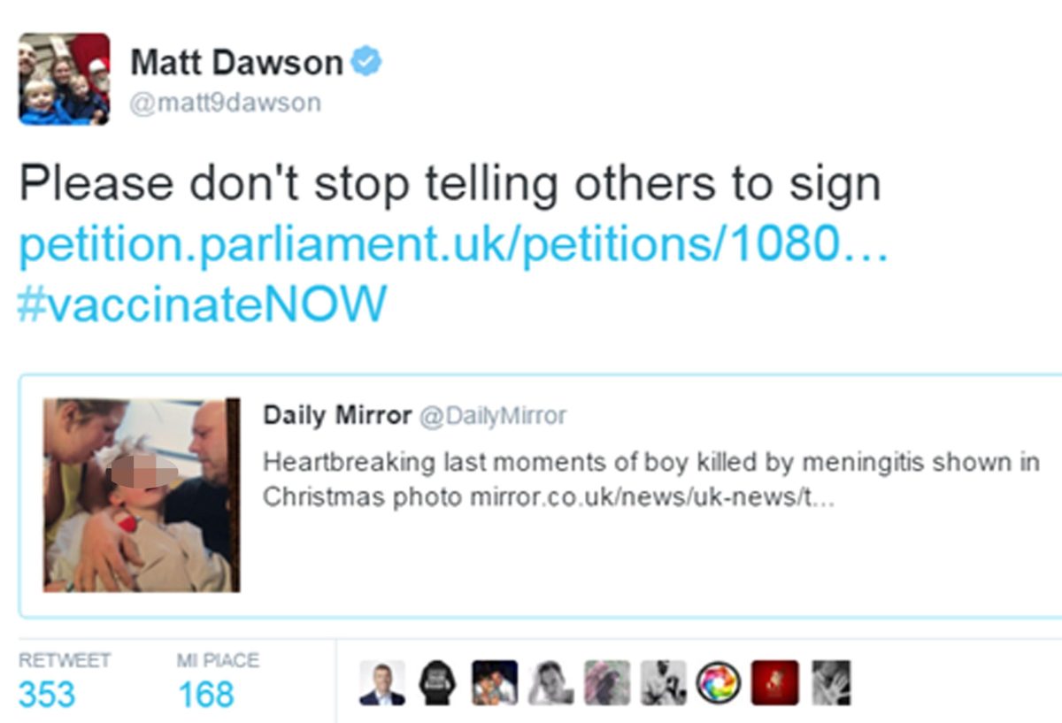 I genitori di Mason, Claire e Mark Timmis, hanno deciso di pubblicare su Twitter la foto del figlio pochi istanti prima di morire allo scopo di sensibilizzare l’opinione pubblica sulla necessità di rendere obbligatorio per tutti il vaccino contro il ceppo B della meningite fino agli undici anni.