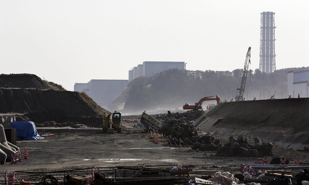 22 novembre 2016. Due operai nel cantiere per la costruzione di un argine antitsunami nei pressi dell’impianto nucleare della TEPCO di Fukushima Daini, nella città di Naraha, dopo un forte terremoto che ha colpito il nord del Giappone.