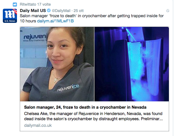 Ventiquattro anni, originaria delle Hawaii, manager del centro di ringiovanimento Rejuvenice in Henderson, Nevada è morta dopo essere rimasta chiusa per 10 ore nella criocamera del suo salone di bellezza.