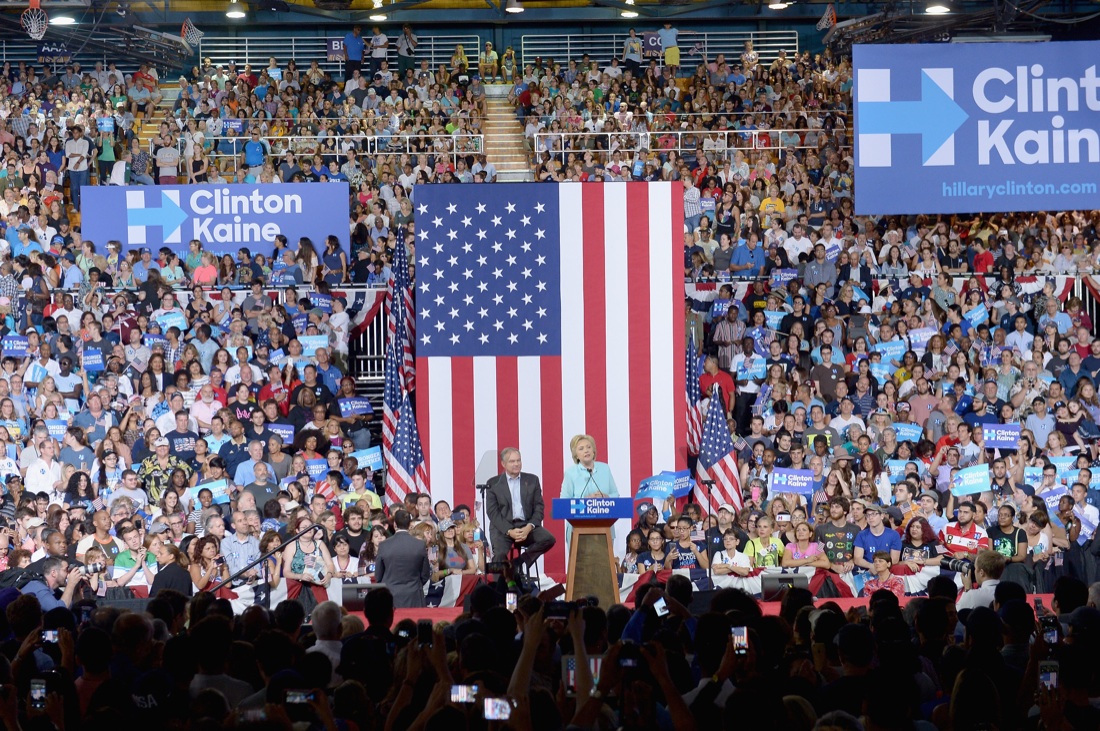 Hillary Clinton e il suo vice Tim Kaine alla loro prima uscita pubblica alla Florida International University Panther Arena di Miami.