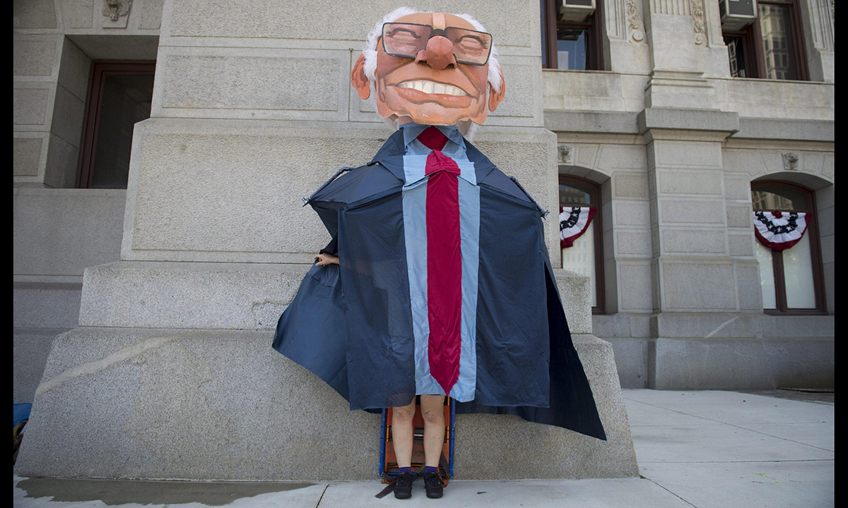 24 luglio 2016. Un sostenitore di Bernie Sanders, sconfitto nelle primarie democratiche da Hillary Clinton, impersona il suo leader di fronte al City Hall di Philadelphia, prima dell’inizio della Convention nazionale dei Democratici, presso il Wells Fargo Center.