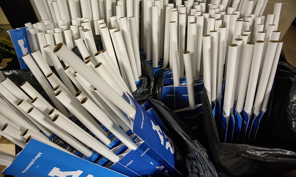 24 luglio 2016. Cartelli pronti per essere distribuiti ai delegati e partecipanti alla Convention nazionale dei Democratici, presso il Wells Fargo Center di Philadelphia, in Pennsylvania.