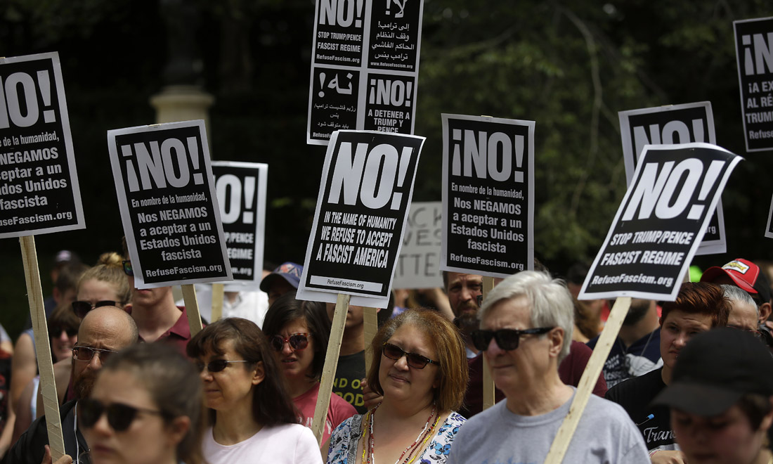 Dimostranti protestano contro l’odio, i gruppi di supremazia bianca e il presidente Trump, domenica 13 agosto 2017 a Chicago, Illinois. È una manifestazione in risposta agli scontri violenti tenutisi a Charlottesville, Virginia.