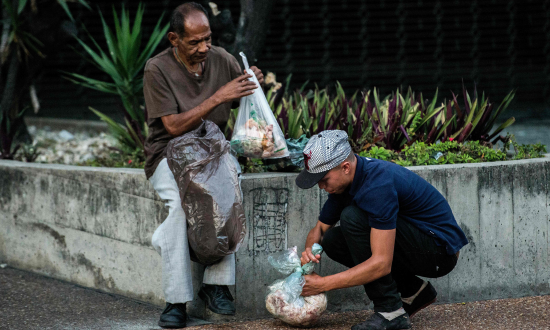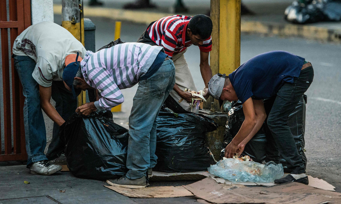 22 febbraio 2017. Uomini costretti a cercare cibo nei cassonetti della spazzatura lungo una strada di Caracas, in Venezuela.