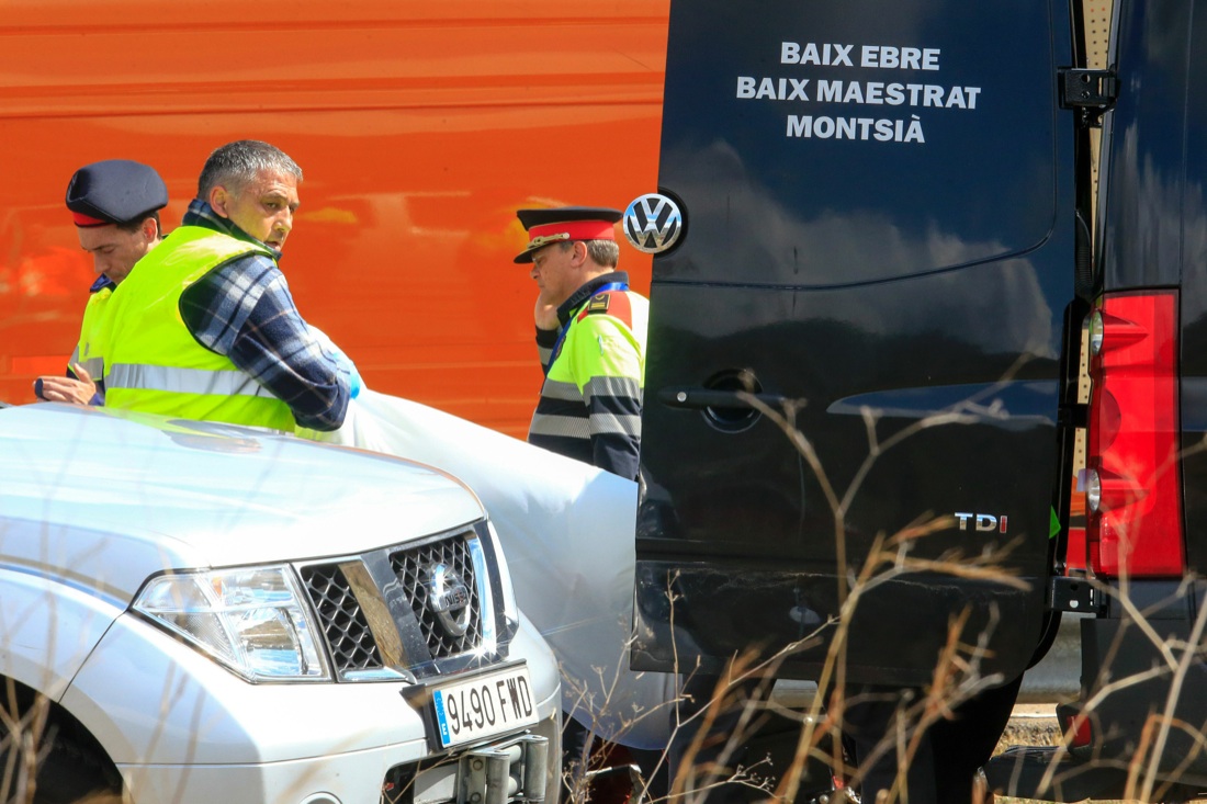 Tarragona, Spagna, 20 marzo 2016, i primi accertamenti sul luogo dell’incidente all’autobus che riportava un gruppo di studenti in Erasmus da Valencia a Barcellona