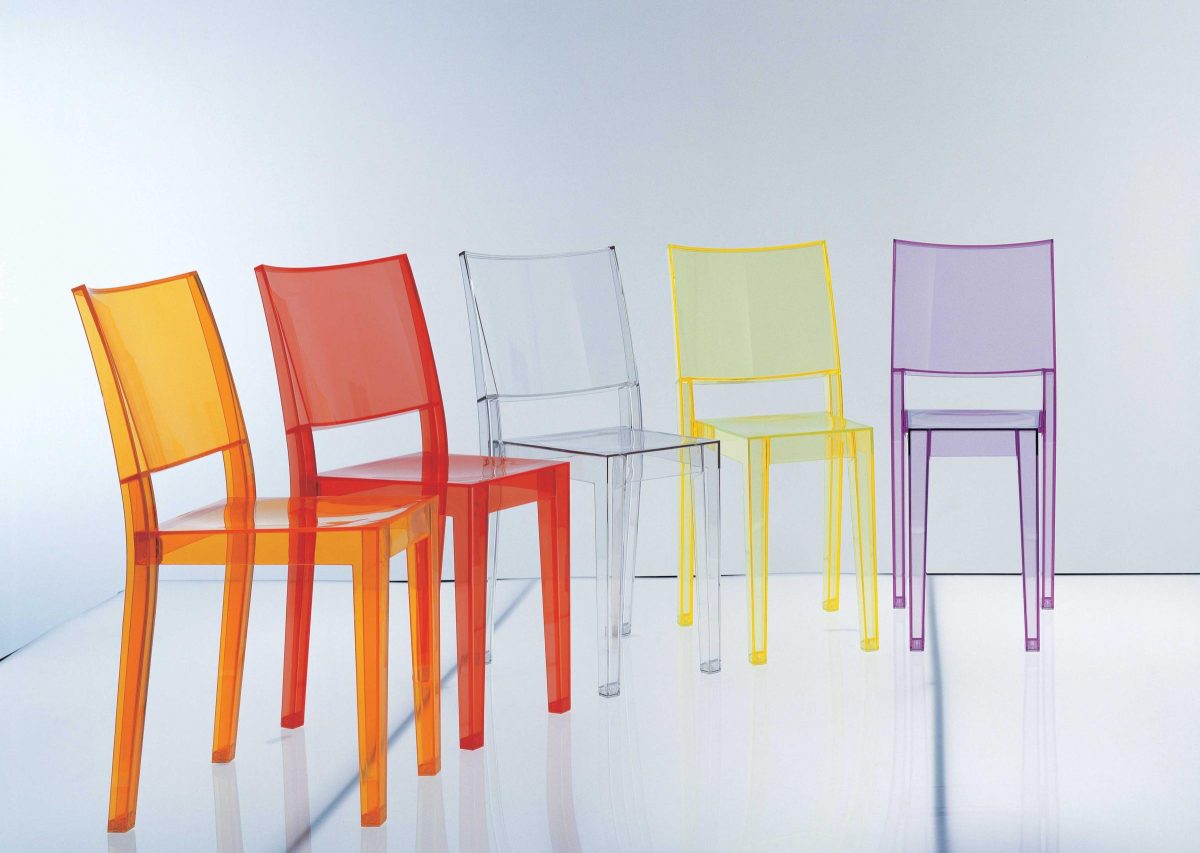 Claudio Luti, at Kartell, produces transparent chairs made from the same material as riot shields, but designed by Philippe Starck.