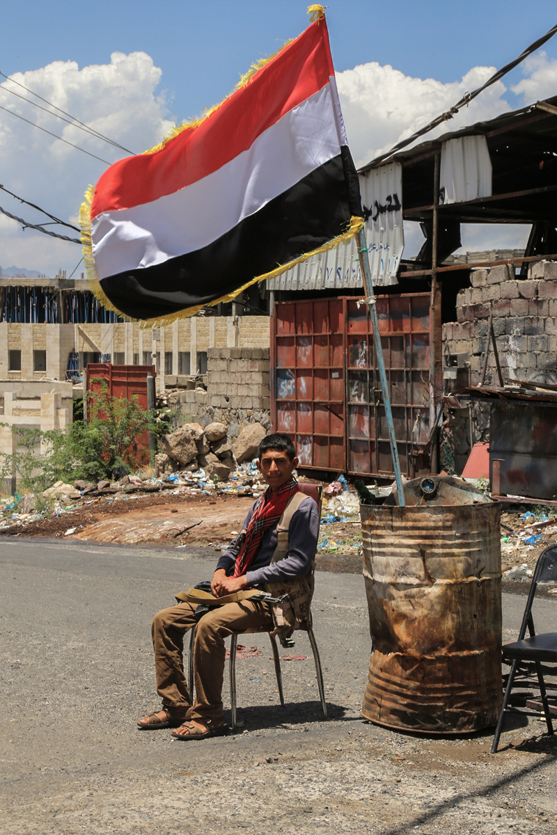 11 aprile 2016. Un combattente fedele al presidente in esilio Abedrabbo Mansour Hadi di guardia a un check point lungo una strada di Taez, Yemen.