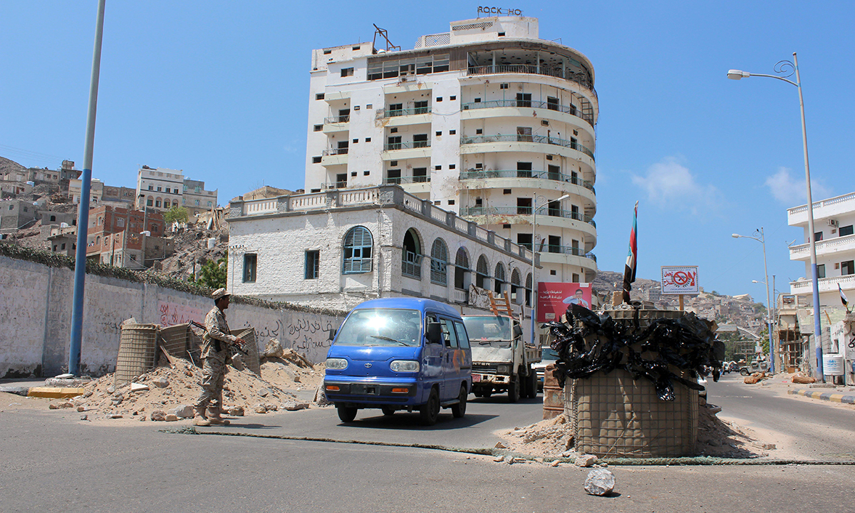 11 aprile 2016. Lealisti a un checkpoint lungo una strada nel quartiere di Tawahi ad Aden, Yemen.