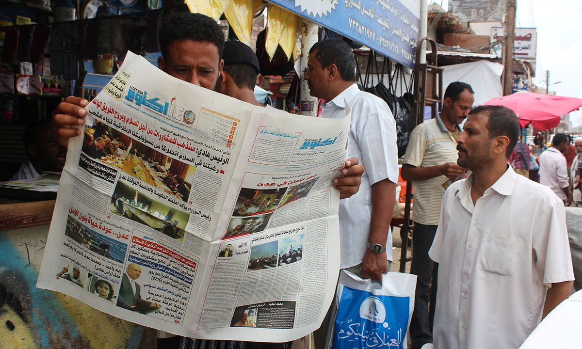 10 aprile 2016. Un uomo legge un giornale lungo una strada di Aden, in Yemen.