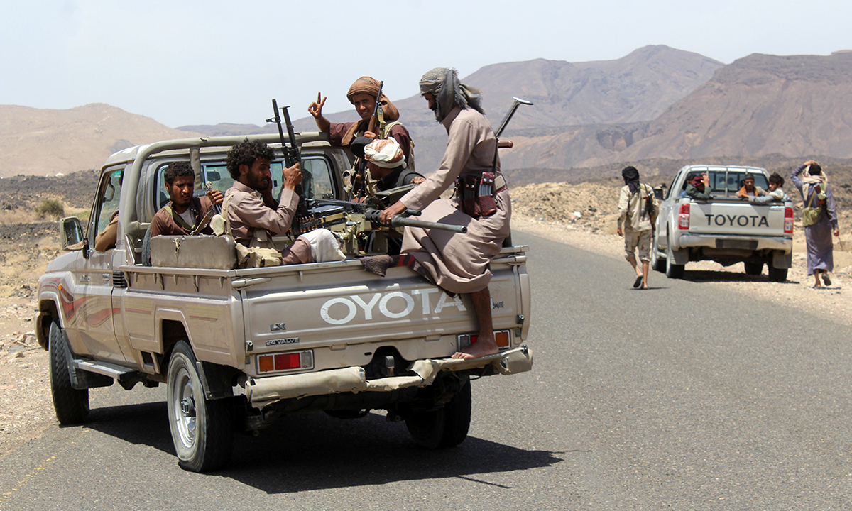 9 aprile 2016. Provincia di Marib, in Yemen, combattenti fedeli al presidente esiliato, sostenuti dalla coalizione a guida saudita, si muovono a bordo di un veicolo durante un’offensiva contro alcune postazioni dei ribelli Houthi, alla vigilia dell’entrata in vigore del cessate il fuoco.