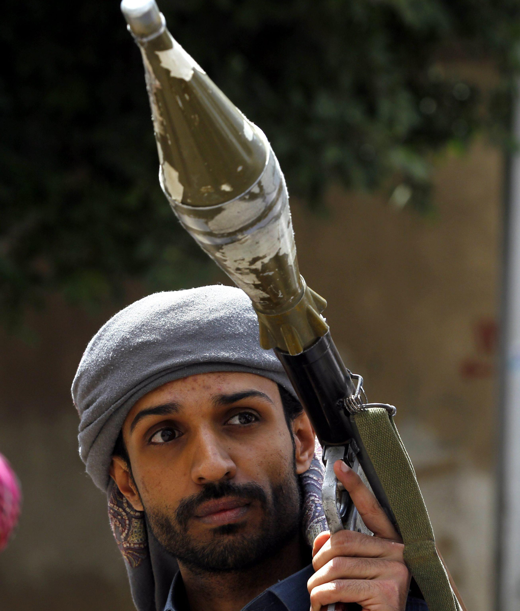 7 aprile 2016. Un ribelle Houthi impugna un lanciagranate portatile RPG-7 durante un evento pubblico per la raccolta di aiuti in cibo, durante cui i ribelli sciiti hanno cercato di mobilitare nuovi combattenti, pochi giorni prima dell’entrata in vigore del cessate il fuoco.
