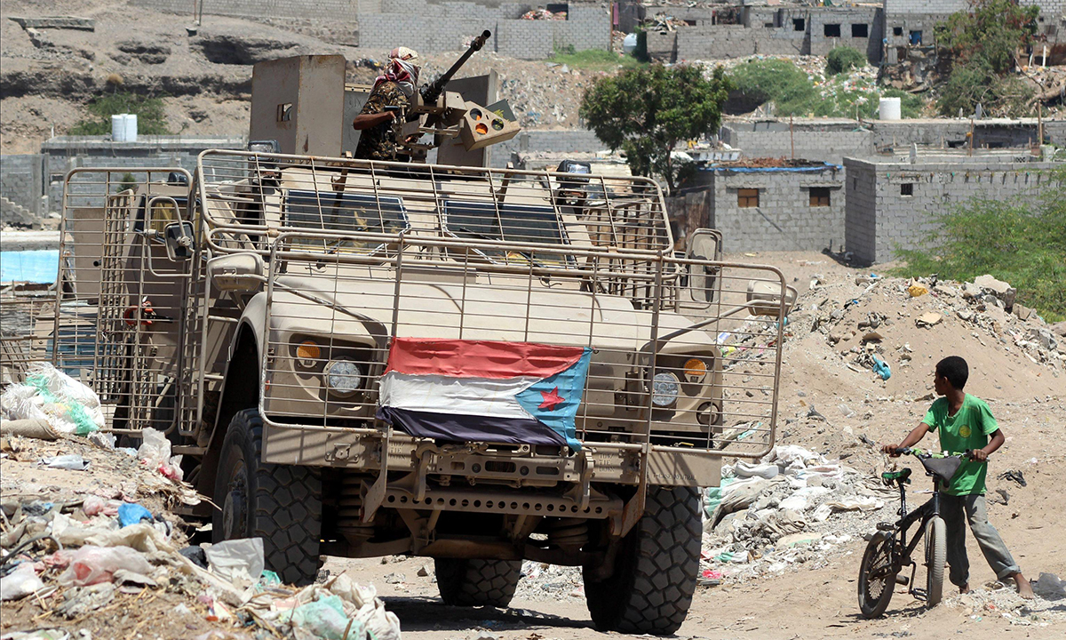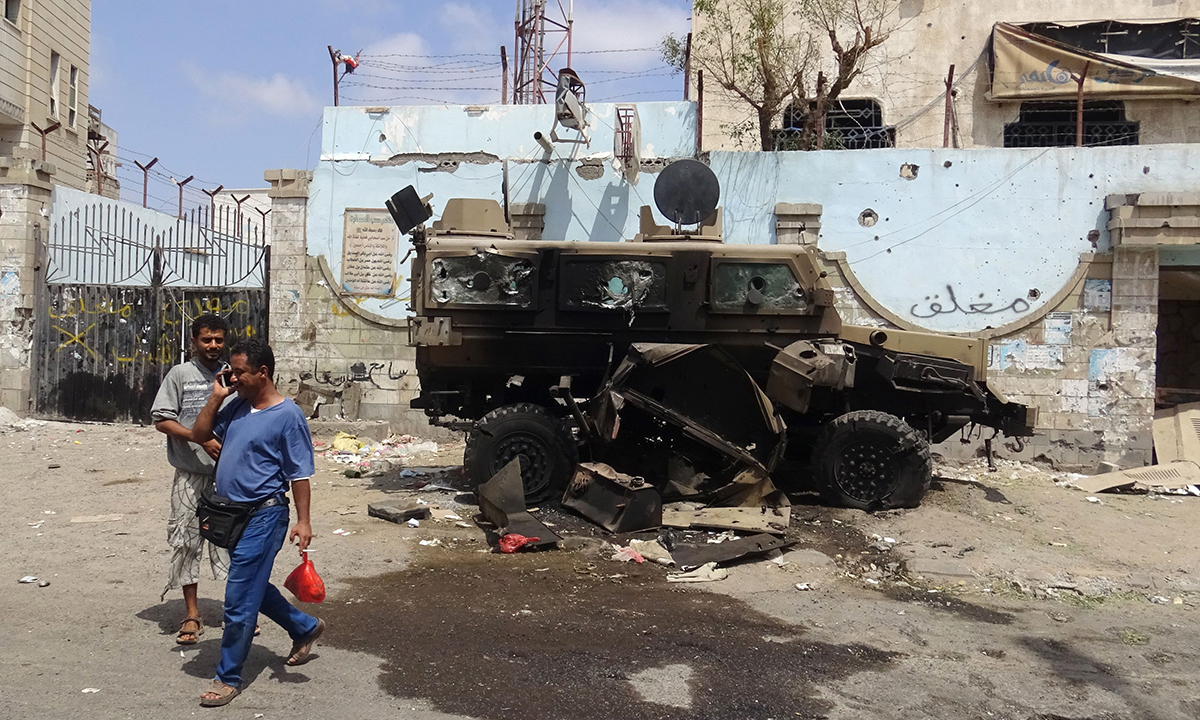 Aden, Yemen, 14 marzo 2016. Un veicolo blindato della coalizione a guida saudita alla ricerca del relitto di un aereo da caccia degli Emirati Arabi Uniti precipitato nella città portuale meridionale del Paese.