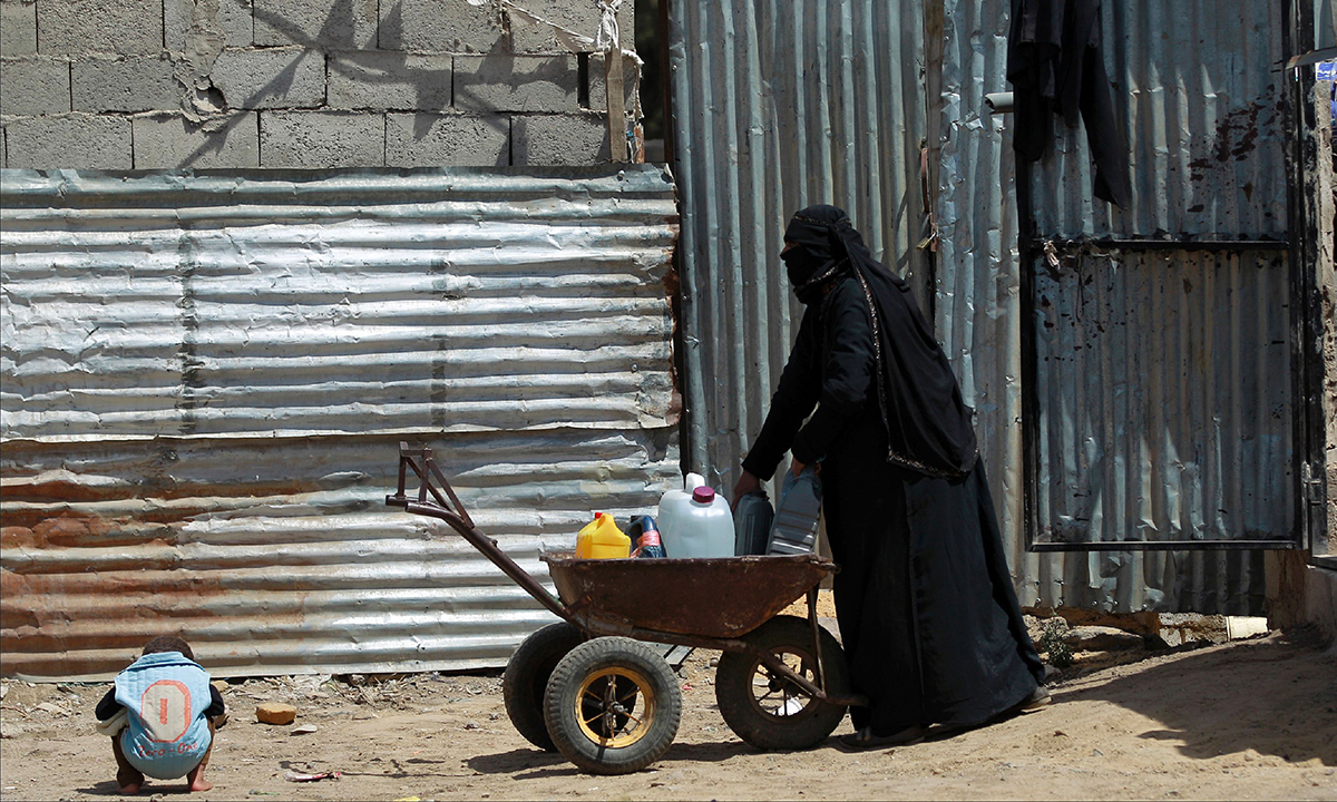 Sana’a, Yemen, 12 marzo 2016. Una donna trasporta acqua potabile in un quartiere povero della capitale.