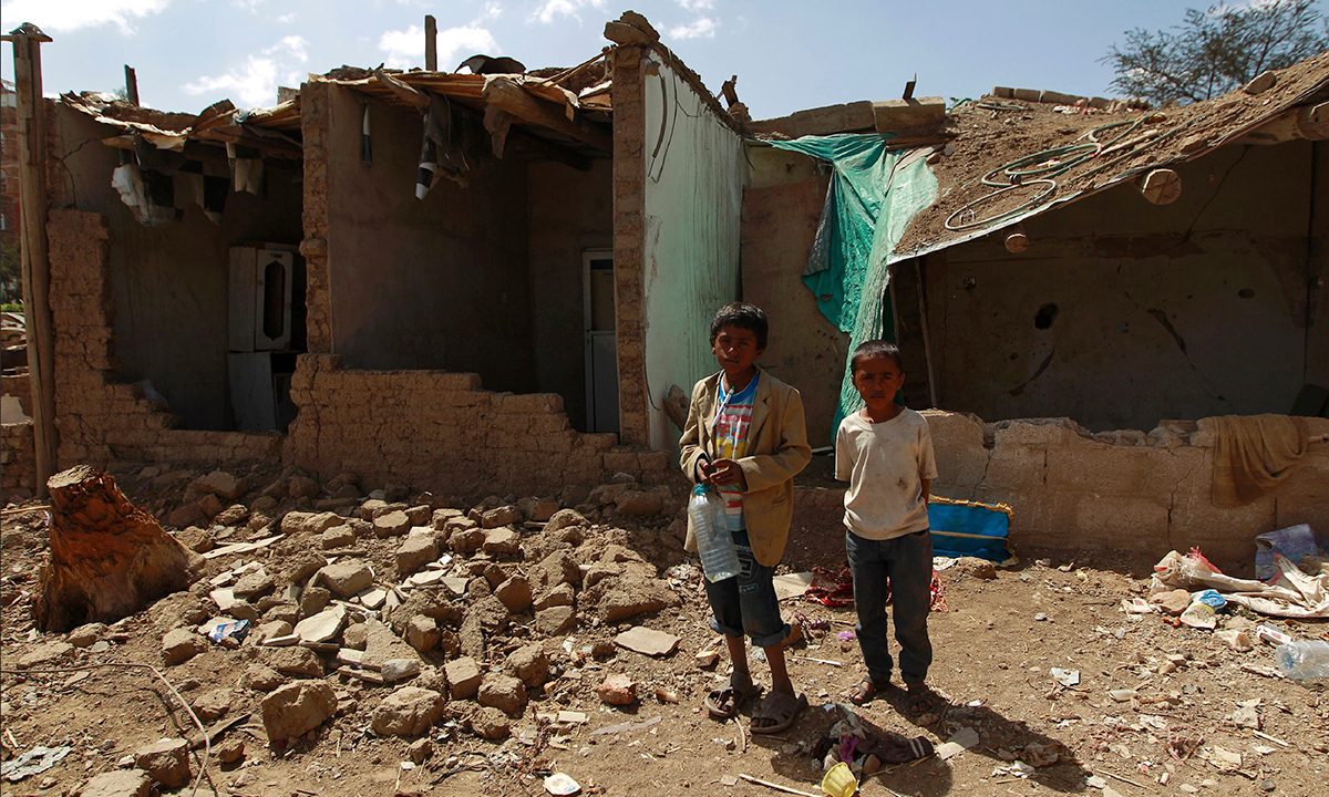 Sana’a, Yemen, 12 marzo 2016. Due bambini di fronte alle abitazioni distrutte nel corso di diversi mesi di combattimenti.