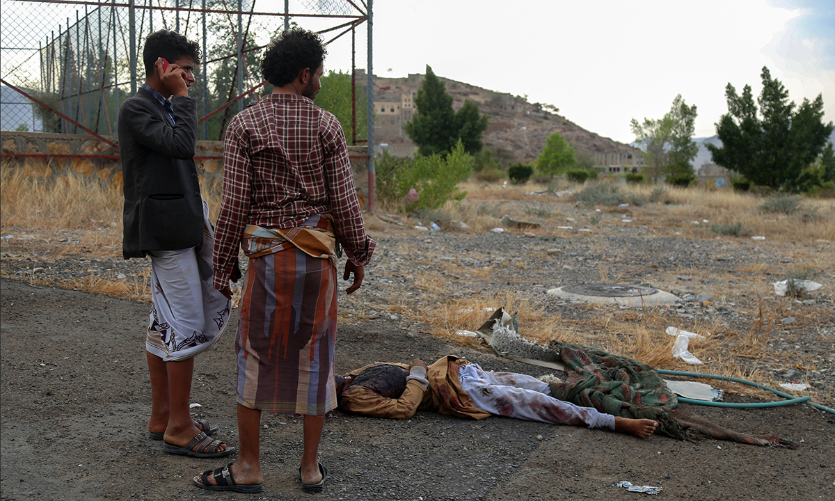 12 marzo 2016. A Ta’izz, in Yemen, soldati dei gruppi tribali che formano i Comitati di resistenza popolare, a supporto del presidente deposto e esiliato Abd Rabbuh Mansur Hadi, accanto al cadavere di un ribelle sciita Huthi.