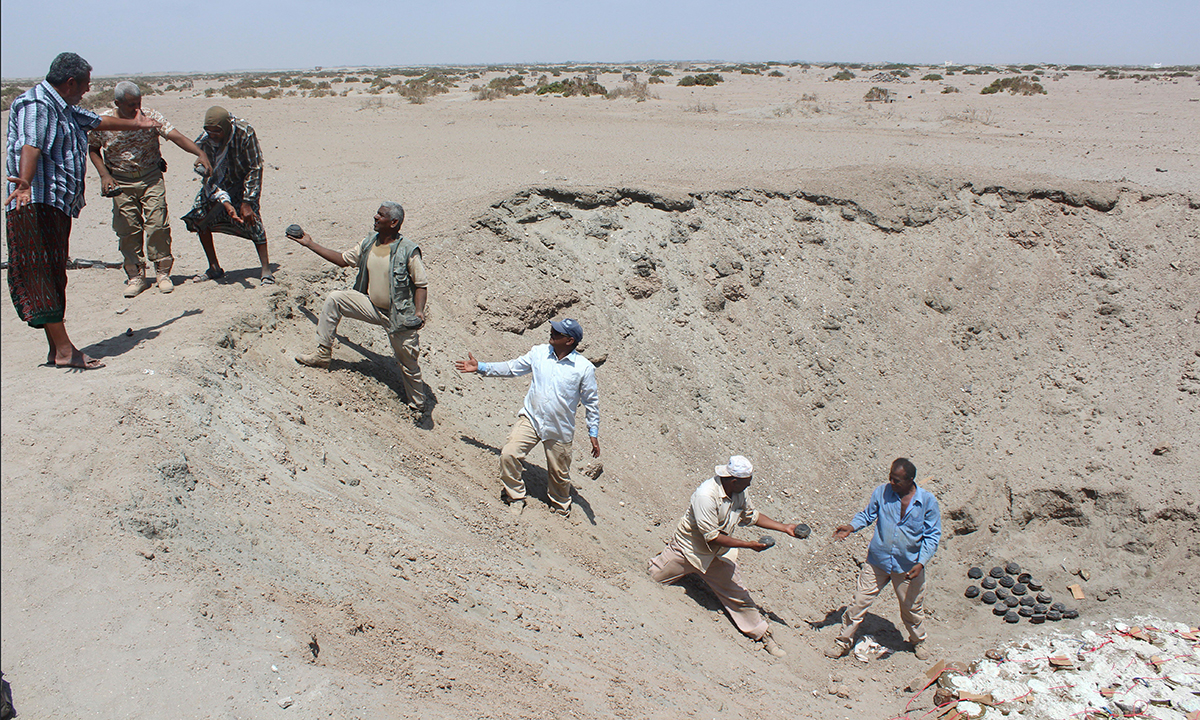 Deserto di al-Alam, Yemen, 10 marzo 2016. Forze di sicurezza yemenite preparano l’esplosione controllata di ordigni rimasti inesplosi confiscati ai ribelli sciiti Huthi e ai combattenti jihadisti, a est della città portuale.