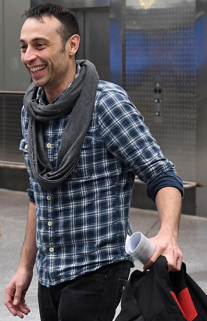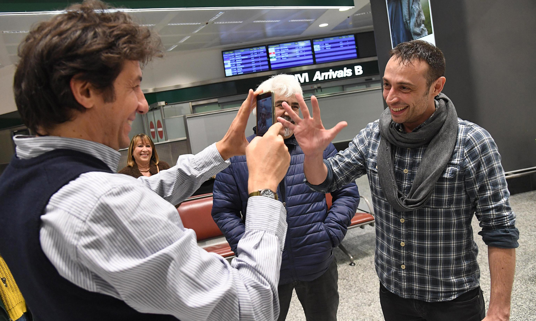 11 maggio 2017. Yuri Guaiana (a destra) al suo arrivo all’aeroporto di Malpensa, di ritorno da Mosca.