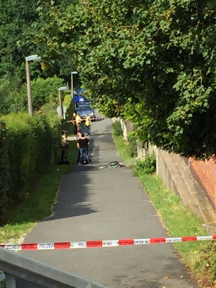 La polizia indaga sulla borsa abbandonata e data alle fiamme a Zirndorf, nei pressi di Norimberga, in una stradina che costeggia una colonia di piccole casette con giardino, a circa 150 metri dal centro di prima accoglienza per profughi. 27 luglio 2016 EPA/DANIEL KARMANN