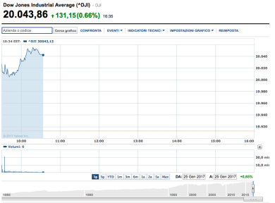 Record storico a Wall Street: il Dow Jones supera i 20 mila punti