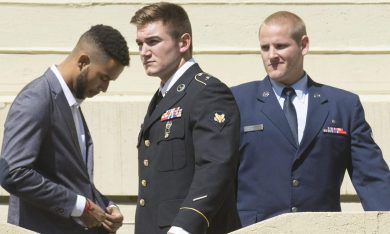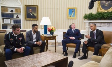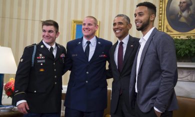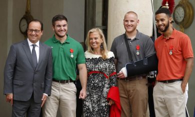 epaselect epa04895800 French President Francois Hollande (L) poses for photographs with US servicemen Alek Skarlatos (2-L) and Spencer Stone (2-R), US student Anthony Sadler (R) and US Ambassador to France Jane Hartley (C) after an honorary ceremony at the Elysee Palace in Paris, France, 24 August 2015. The four men who stopped a Moroccan citizen Ayoub El-Khazzani who opened fire on a high-speed Thalys train travelling to Paris from Amsterdam leaving at least two people injured, were awarded the country’s Legion d’Honneur medal. EPA/YOAN VALAT