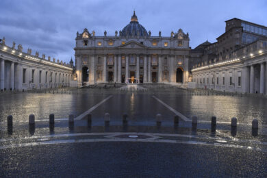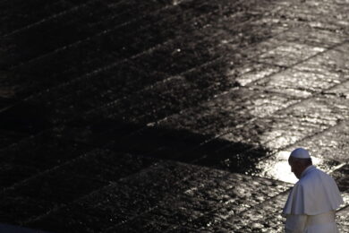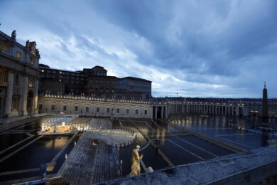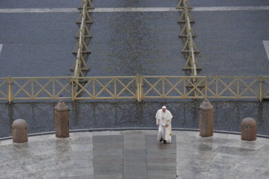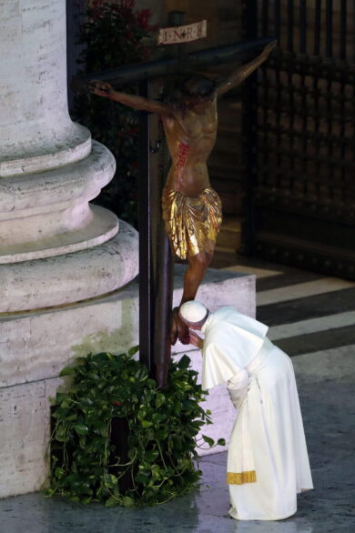 epa08327193 A handout photo made available by Vatican Media shows Pope Francis delivering an extraordinary ‘Urbi et Orbi’ blessing – normally given only at Christmas and Easter – from an empty St. Peter’s Square, as a response to the global coronavirus disease (COVID-19) pandemic, the Vatican, 27 March 2020. The blessing was live streamed worldwide giving the possibility for the faithful connected to receive the plenary indulgence. EPA/VATICAN MEDIA HANDOUT +++ HO – NO SALES, EDITORIAL USE ONLY +++ HANDOUT EDITORIAL USE ONLY/NO SALES