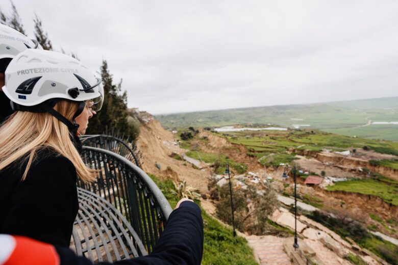 Meloni torna a Niscemi dopo il ciclone Harry: 150 milioni, commissario straordinario e decreto immediato