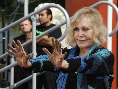 epa03182805 US actress Kim Novak holds out her cement covered hands during a ceremony honoring her at Grauman’s Chinese Theater in Hollywood, California USA 14 April 2012. Novak starred in such classic films as Vertigo, The Man with the Golden Arm and Pal Joey. EPA/MICHAEL NELSON