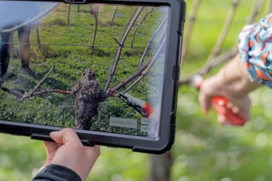 PRODUCTION – 26 March 2024, Rhineland-Palatinate, Oppenheim: The display of a tablet shows the points at which the vine is to be pruned. After uploading the scanned vine, the prototype app for smartphone and tablet evaluates the data using AI and specifies the pruning points. Pruning grapevines is a time-consuming process that requires specialist knowledge and skilled workers. Artificial intelligence should help with pruning. Photo: Andreas Arnold/dpa (Photo by Andreas Arnold/picture alliance via Getty Images)