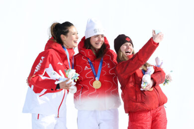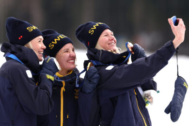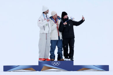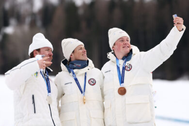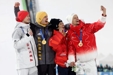VAL DI FIEMME, ITALY – FEBRUARY 09: Gold medalist Philipp Raimund of Team Germany, Silver medalist Kacper Tomasiak of Team Poland and Joint Bronze medalists Ren Nikaido of Team Japan and Gregor Deschwanden of Team Switzerland pose for a photo on the podium by taking a victory selfie during the medal ceremony for the Men’s Normal Hill Individual on day three of the Milano Cortina 2026 Winter Olympic games at Predazzo Ski Jumping Stadium on February 09, 2026 in Val di Fiemme, Italy. (Photo by Maddie Meyer/Getty Images)