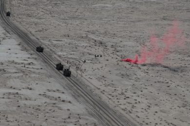 Galleria foto Articolo – foto 1 Il fumogeno rosso segnala la zona di atterraggio in attesa dell’arrivo di un elicottero Medevac (evacuazione sanitaria) al Dugway Proving Grounds (Photo by Maj. Justin Hurt) Leggi l’articolo