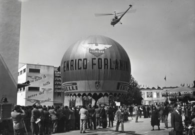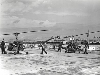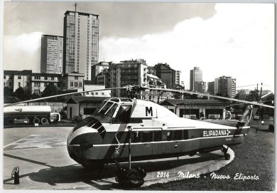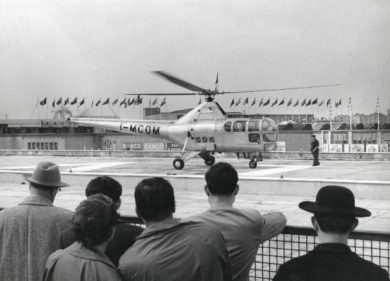 Galleria foto Articolo – foto 1 Anni ’50: Un elicottero di grandi dimensioni all’eliporto della Fiera Campionaria (Archivio Storico Fondazione Fiera Milano) Leggi l’articolo