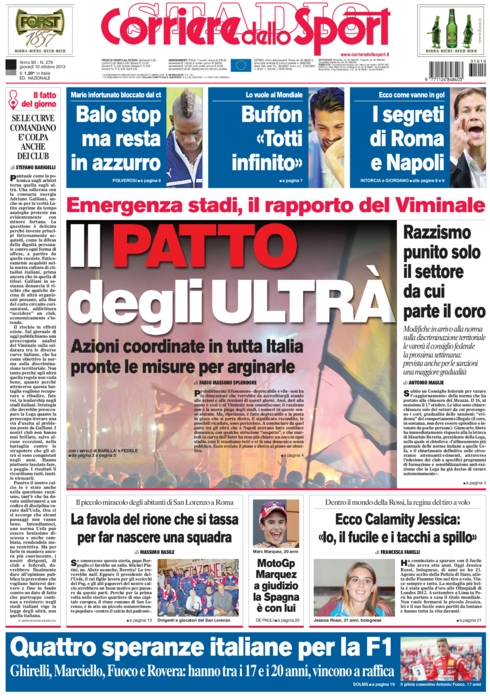 Il ricatto degli ultras, che preparano azioni coordinate per fermare il campionato di calcio. Le parole di Platini, presidente dell’Uefa, e il progetto di modificare in parte le norme antirazzismo. Tevez esclusivo per Tuttosport che parla della Juventus e di Papa Francesco.