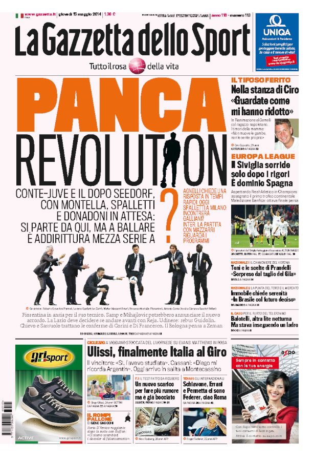 La serie A è in fibrillazione per il valzer di tecnici che può partire se davvero Conte lascia la Juventus (ma Agnelli è tentato dal trattenerlo). Intanto si prepara l’ultima giornata di campionato in cui è viva solo la corsa per l’Europa League e si pensa anche al mercato. Il Siviglia beffa il Benfica e conquista l’EL nella finale di Torino. Balotelli di nuovo sui giornali per una rissa in discoteca nella notte del derby…