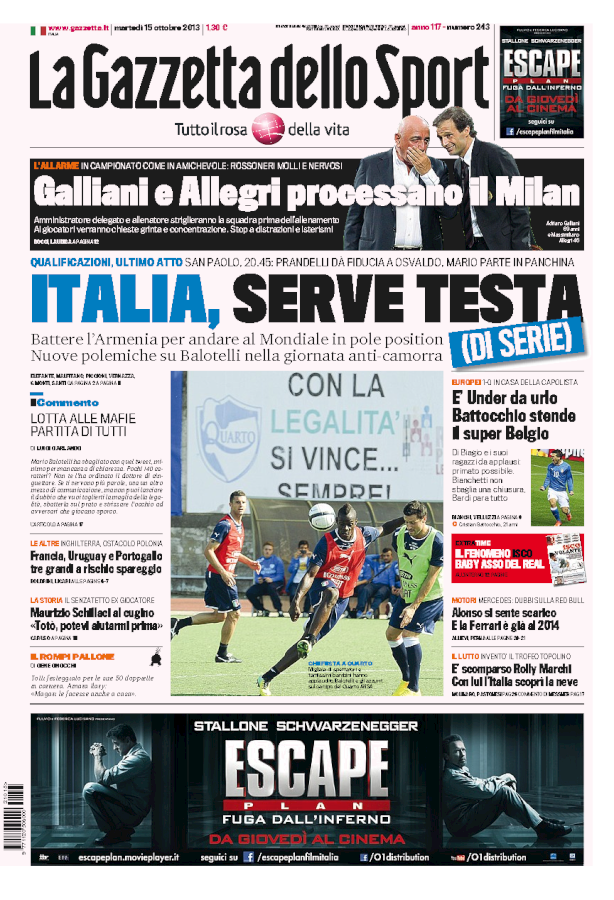 L’Italia cerca contro l’Armenia il successo che le vale la posizione di testa di serie al mondiale brasiliano. Prandelli che bacchetta Balotelli dopo le ultime polemiche, Allegri e Galliani che processano il Milan dopo la figuraccia di Caen e le difficoltà di Buffon in questo inizio di stagione.