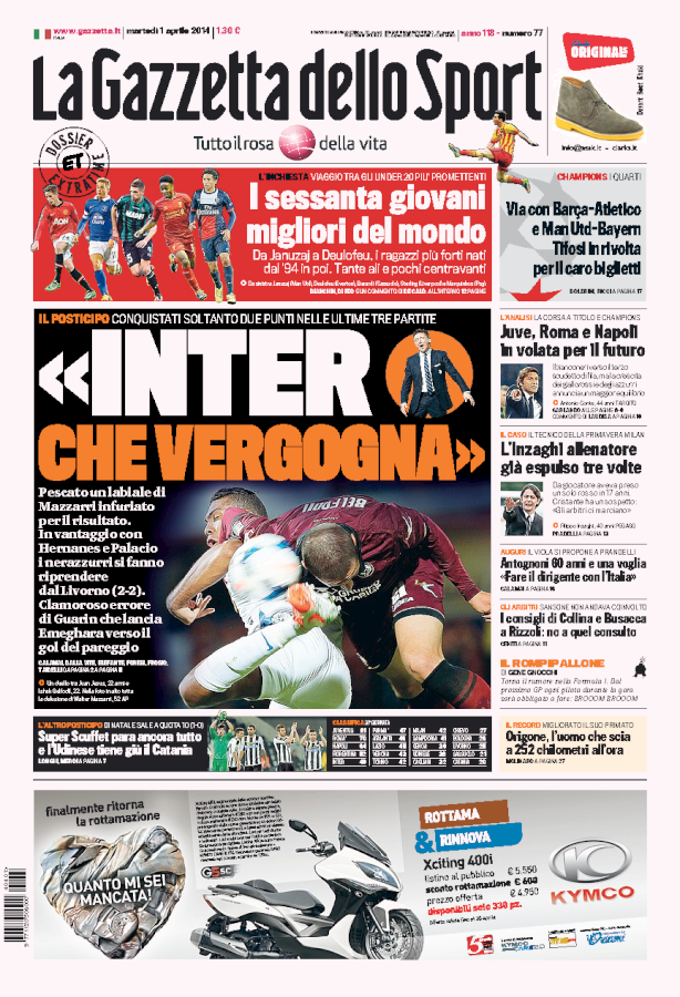 La squadra di Mazzarri si fa rimontare due gol dal Livorno e resta a rischio qualificazione per l’Europa League. Il tecnico se la prende con i giocatori e i tifosi con lui e con Guarin. Ancora una prestazione da grande portiere di Scuffet. Questa sera iniziato i quarti di finale più spettacolari di sempre nella Champions League….