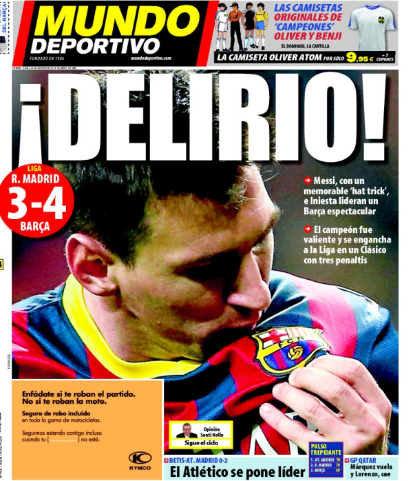 L’incredibile spettacolo del Clasico, vinto 4-3 dal Barcellona con tripletta di Messi, tre rigori assegnati e mille polemiche. In Italia si salva (per il momento) Seedorf che pareggia all’Olimpico, vola la Juventus, cadono in casa Inter e Napoli: è riaperta la lotta per un posto in Champions League. E’ scattato il Mondiale della Moto Gp ed è stato subito gran spettacolo…