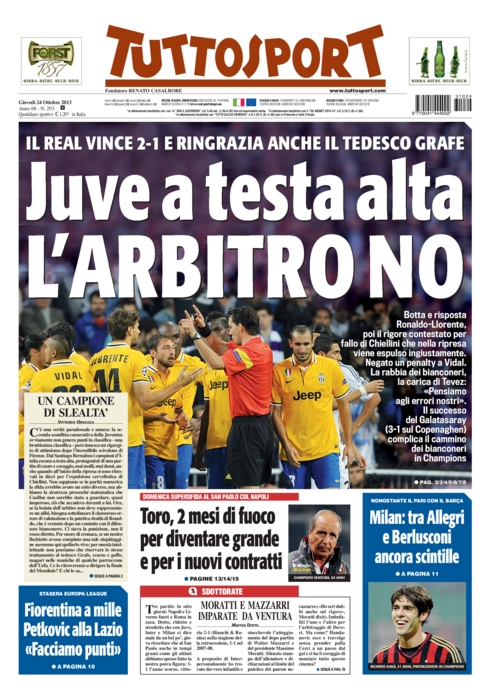 La Juve che esce con una sconfitta dal Bernabeu e denuncia gli errori dell’arbitro Grafe, la situazione compromessa nel girone di Champions, le scintille tra Berlusconi e Allegri, la Roma che ha fissato il premio scudetto e le difficoltà dell’Inter, alle prese con gli infortuni.