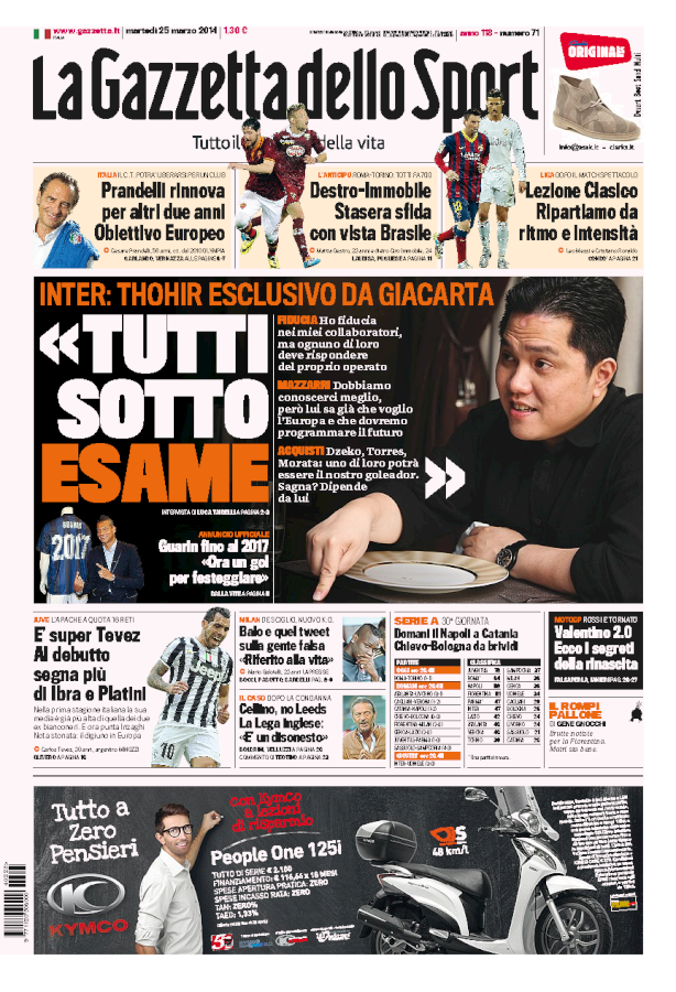 Barbara Berlusconi che spiega come Seedorf è arrivato sulla panchina del Milan. Thohr che da Giakarta fa le carte al futuro dell’Inter e promette un grande mercato (se arriverà l’Europa). Il rinnovo di Prandelli come ct dell’Italia con clausola di uscita per un club e il campionato che torna con Roma-Torino…