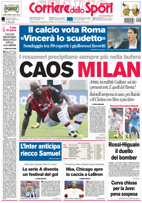 La crisi del Milan e le voci di Berlusconi infastidito che pensa alla sostituzione di Allegri (se le cose non cambiano), Balotelli che potrebbe finire al Chelsea con Mourinho, il pranzo tra Agnelli e Blatter e la vigilia di Atalanta-Inter, sfida che apre la decima di serie A.