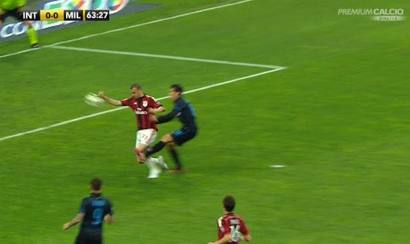 Non una domenica positiva per gli arbitri italiani e l’errore più grave arriva in fondo, nel derby di Milano. Banti sbaglia ad interpretare l’episodio clou di Inter-Milan: era da rigore il mani di Antonelli su conclusione ravvicinata di Hernanes. E’ vero che la distanza è minima, ma le moviole sono concordi nel dire che il difensore tiene troppo largo il braccio per poter essere perdonato. Errore grave e che segna la partita altrimenti discretamente diretta: giusto il fuorigioco che cancella il vantaggio rossonero e altrettanto giusta la chiamata sulla trattenuta di Palacio che sbilancia un difensore nell’azione dell’autorete di Mexes.