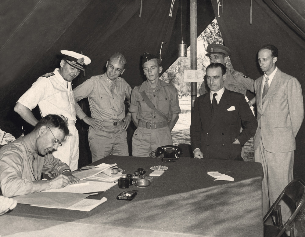 Cassibile (Siracusa), 3 settembre 1943. Nell’oliveto di Cassibile, presso la tenda dove è stato appena firmato l’armistizio tra il Regno d’Italia e le Forze Alleate, i firmatari posano per una foto. Da sinistra, il Brigadiere Generale inglese Kenneth Strong, il Generale italiano Giuseppe Castellano, il Generale statunitense Walter Bedell Smith (futuro direttore della CIA) e il funzionario del Ministero degli Esteri italiano Franco Montanari, interprete per Castellano.